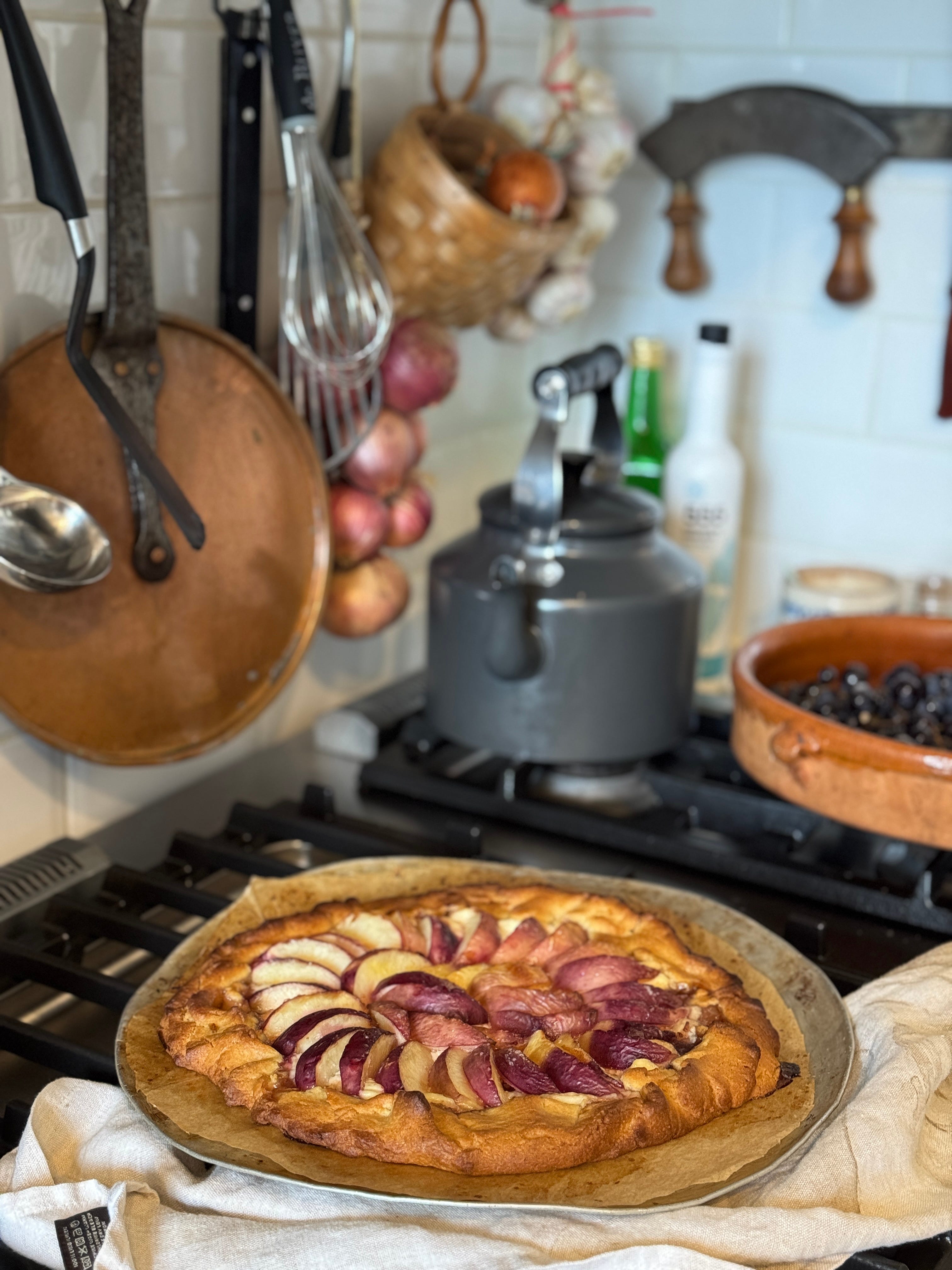 The beauty of this pastry is that it adapts with the seasons. Pears, figs, apples, grapes or a little quince paste with some ruby-red poached quince slices slip in just as happily, and though it doesn’t need much else, a scoop of proper vanilla ice-cream alongside makes it irresistible. If you can’t find Madame Loïk, mascarpone, whipped ricotta, or even a little labneh will do just as well.