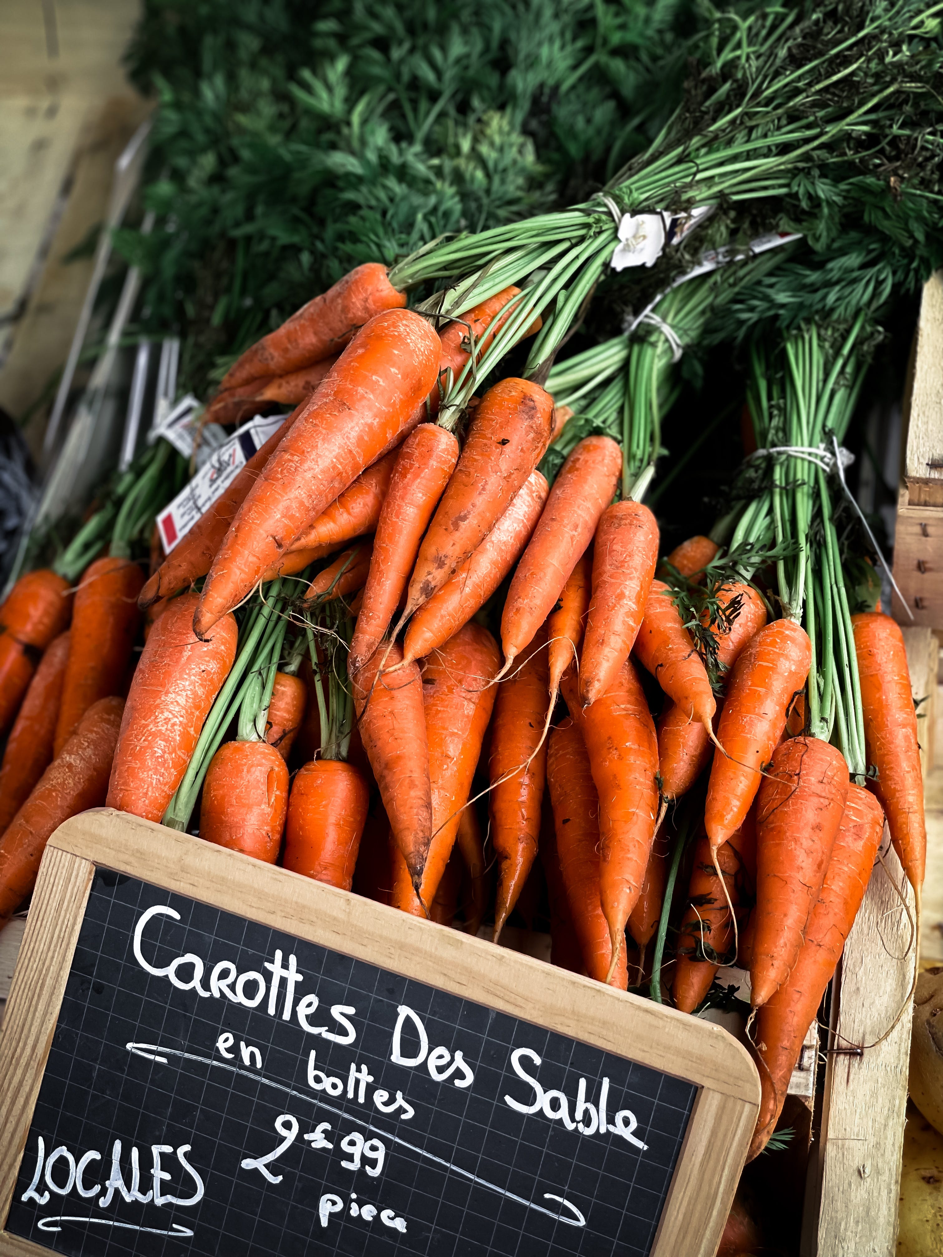 🍇 Grapes – The vendanges are underway by mid-september, and the market is filled with bunches of Muscat covered with a silvery bloom and Chasselas de Moissac, a prized AOP table grape from southwest France. Sweet, perfumed, and tasting of late-summer sun. I love to roast them with sausages and red onions, finished with a little balsamic vinegar when the pan’s still hot. Serve with creamy mashed potato!